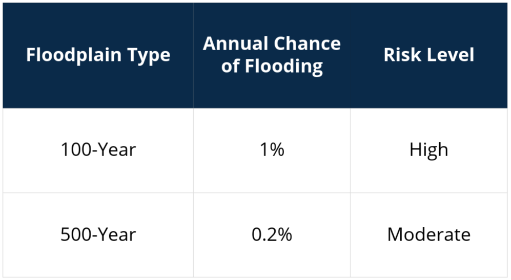 A 100-year floodplain means an area has a 1% chance of flooding in any given year. Other areas are even less likely to experience flooding. A 500-year floodplain means an area has a 0.2% chance of flooding in any given year. The location of floodplains is determined by the Federal Emergency Management Agency (FEMA) and can be viewed at its Flood Map Service Center.